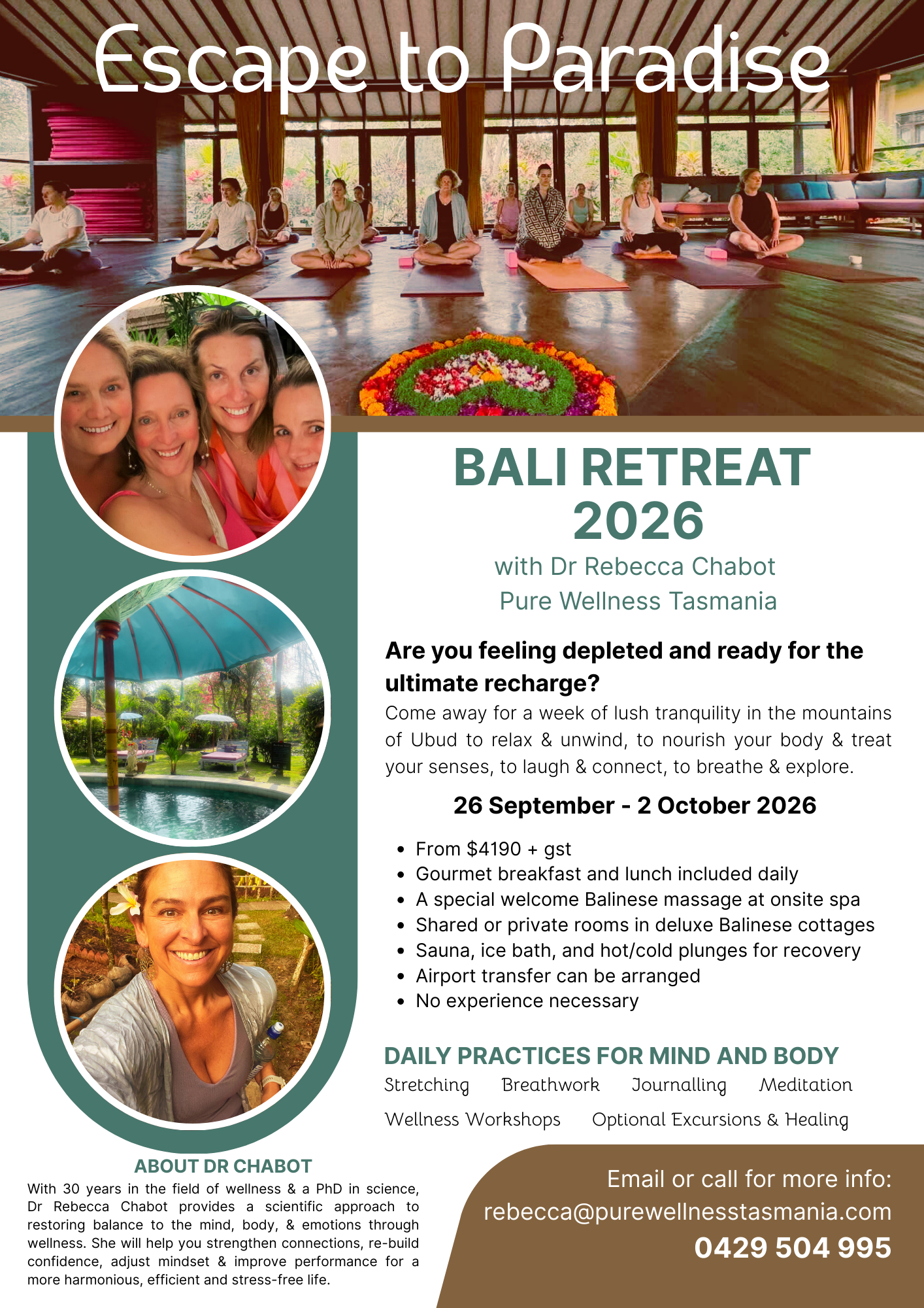 Join Dr Rebecca Chabot on a transformative journey to awaken your joy, your wisdom, and your purpose in life. Nestled in the lush tropical mountains of Ubud, our eco-resort sanctuary offers the perfect setting to disconnect from daily stress and reconnect with yourself.
